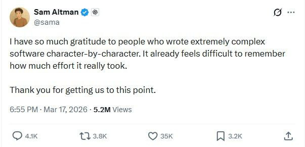 On one screen, Sam Altman is thanking the people who once wrote “extremely complex software character-by-character,” in the same tone a victorious emperor might thank the builders of the road he is about to march an army over.